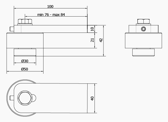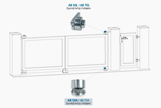 Zgornji tečaj AB 50 A z ležajem za krilna vrata. Nastavljiv odmik: 76-84 mm. Premera: 50 mm in 30 mm.
