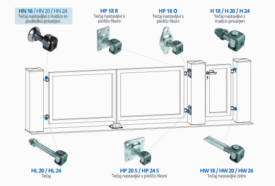 Privarjen nastavljiv tečaj HN 16 z matico M 16 mm in podložko za krilna vrata. Nastavljiv odmik: 50-77 mm.